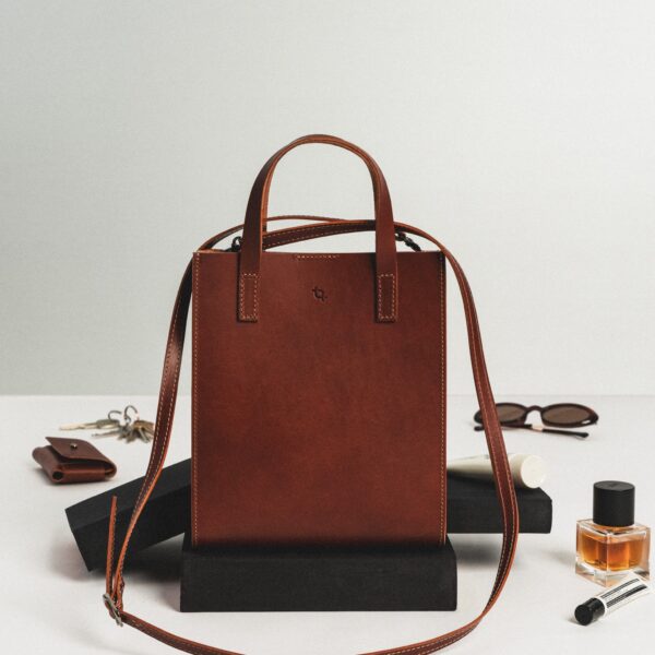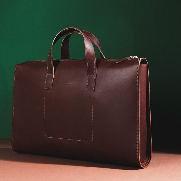 Koti käepidemed on valmistatud pruunist nahast ja kinnitatud metallist neetidega. Kotil on magnetiline sulgur ja kaks sisemist taskut.